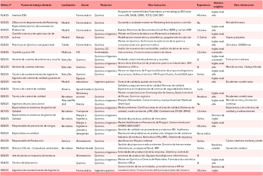 26 NUEVAS OFERTAS DE TRABAJO hemos recibido en la semana 42, de 13 de octubre en el Colegio Oficial de Químicos para titulados en Química,