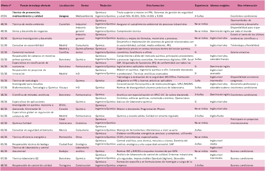 25 NUEVAS OFERTAS DE TRABAJO hemos recibido en la semana 4, de 19 de enero en el Colegio Oficial de Químicos para titulados en Química,