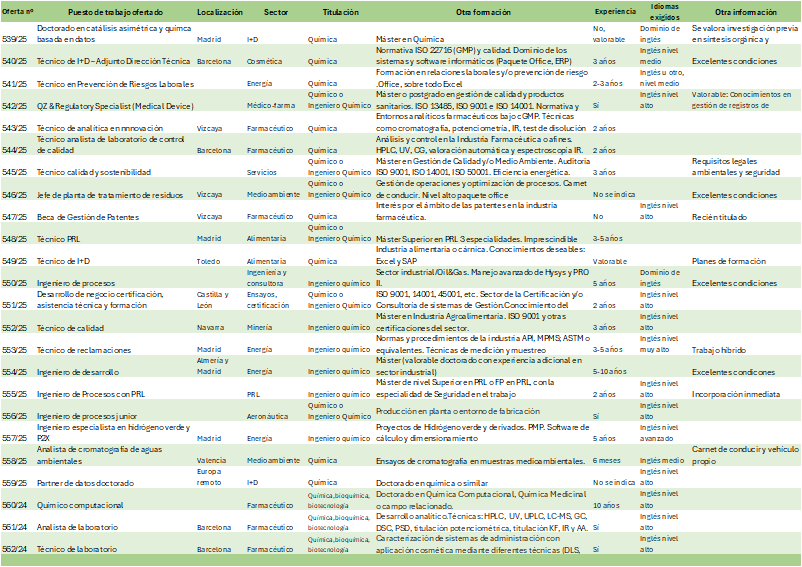 26 NUEVAS OFERTAS DE TRABAJO hemos recibido en la semana 42, de 13 de octubre en el Colegio Oficial de Químicos para titulados en Química,