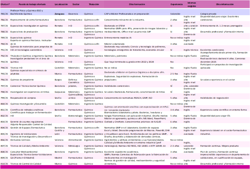 31 NUEVAS OFERTAS DE TRABAJO hemos recibido en la semana 41, de 6 de octubre, en el Colegio Oficial de Químicos para titulados en Química,