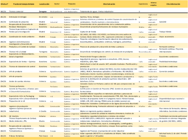 25 NUEVAS OFERTAS DE TRABAJO hemos recibido en la semana 11 de 9 de marzo, en el Colegio Oficial de Químicos para titulados en Química,