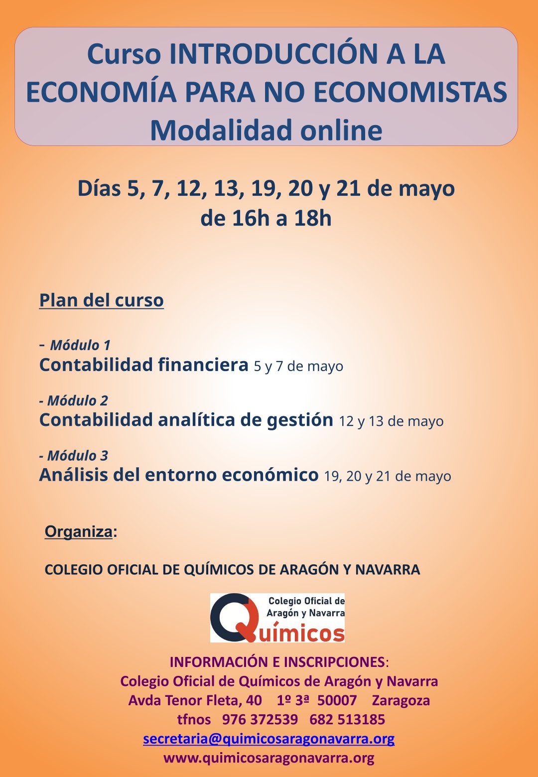 Los interesados en asistir deben ponerse en contacto con el Colegio de Químicos: secretaria@quimicosaragonavarra.org o en el 976 372 539 o 682 513 185