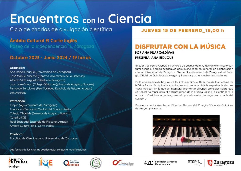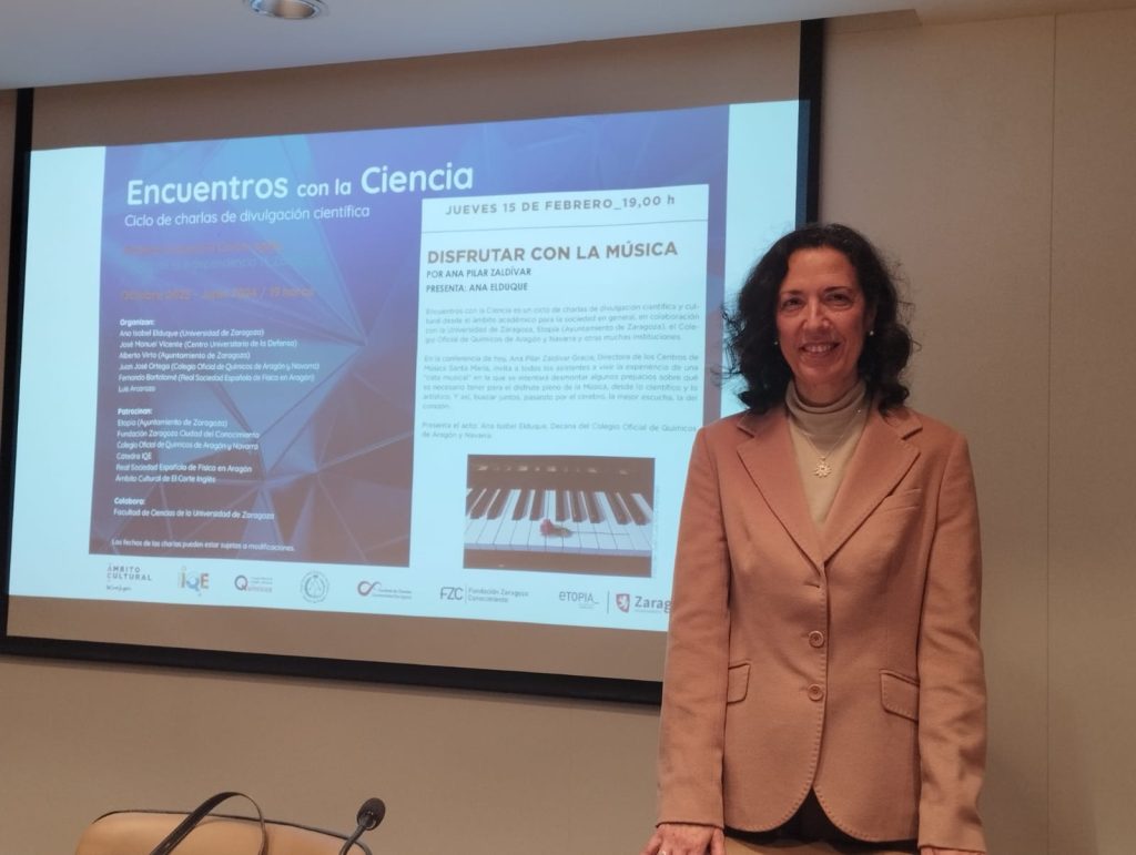 El jueves 15 de febrero a las 19 h, Ana Pilar Zaldívar Gracia, Directora de los Centros de Música Santa María nos deleitó con una magnífica charla » DISFRUTAR CON LA MÚSICA» dentro del ciclo de charlas de divulgación científica y cultural ENCUENTROS con la CIENCIA.
