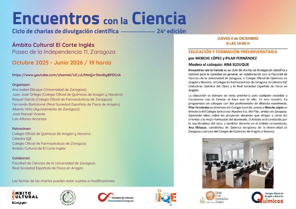 Este ciclo está organizado por el Colegio Oficial de Químicos de Aragón y Navarra, junto a otras instituciones y coordinado por Ana Elduque.