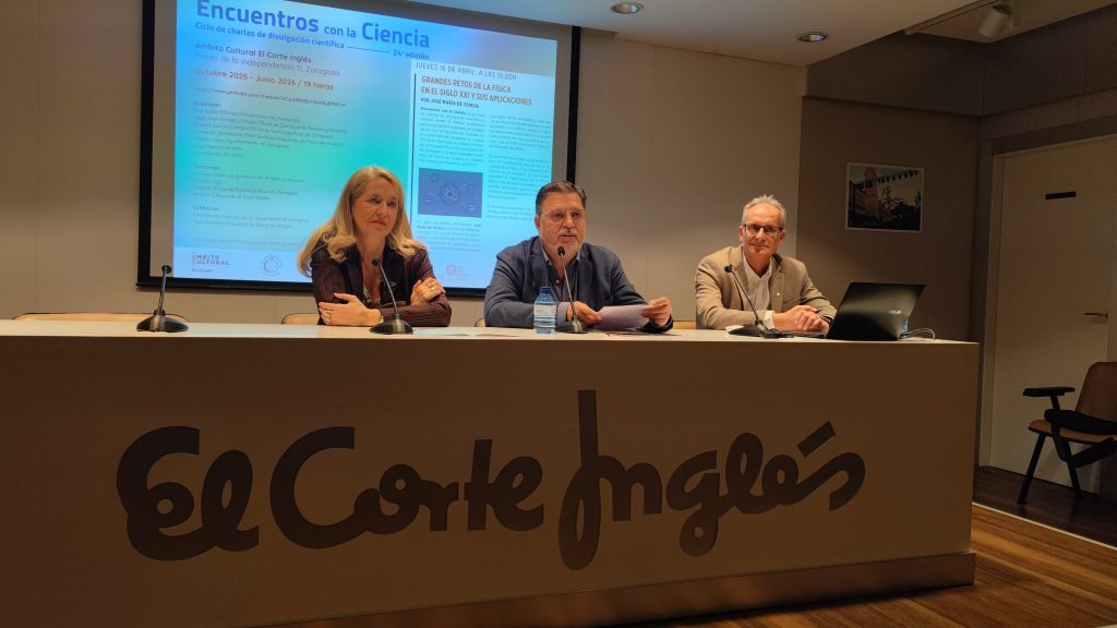 El jueves 16 a las 19h continuando con el ciclo ENCUENTROS con la CIENCIA de este curso 2025-2026, en Ámbito Cultural de El Corte Inglés del Paseo de la Independencia de Zaragoza, tuvo lugar la charla titulada “GRANDES RETOS DE LA FÍSICA EN EL SIGLO XXI Y SUS APLICACIONES” impartida por José María de Teresa, profesor de Investigación del CSIC en el Instituto de Nanociencia y Materiales de Aragón (INMA-CSIC-Universidad de Zaragoza) y presidente electo de la Sociedad Europea de Física