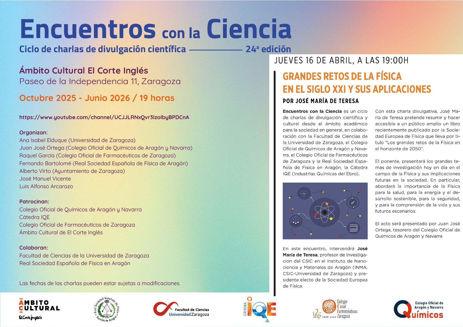 El próximo jueves 16 a las 19h continuamos con el ciclo ENCUENTROS con la CIENCIA de este curso 2025-2026, en Ámbito Cultural de El Corte Inglés del Paseo de la Independencia de Zaragoza.