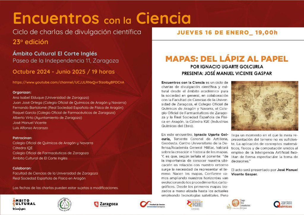 El próximo ENCUENTRO con la CIENCIA será el JUEVES 16 de enero a las 19h en Ámbito Cultural de El Corte Inglés de Independencia. Ignacio Ugarte, teniente coronel de artillería y geodesta nos hablará sobre el origen y creación de los mapas.